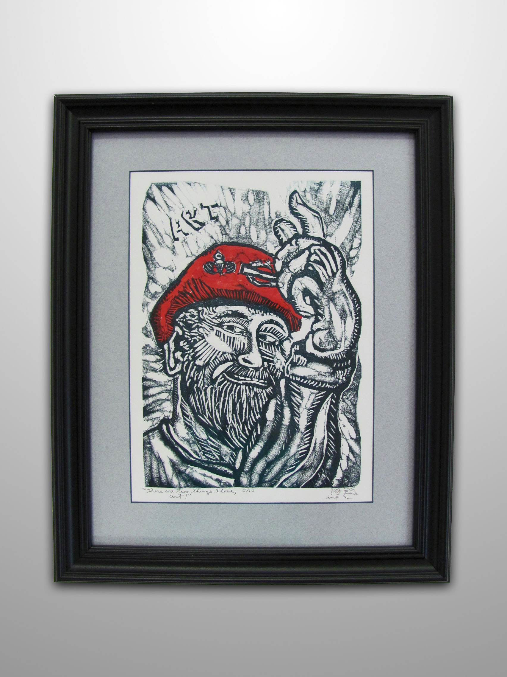 The woodcut is a medium that lent itself particularly well to the drama and detail that characterize Glenn Eure’s work. While he often carved, and printed from, smaller blocks (particularly those that enabled him to incorporate natural grain or features of the wood), he loved to work “big” with slabs as large as seven feet long and close to 30 inches wide.